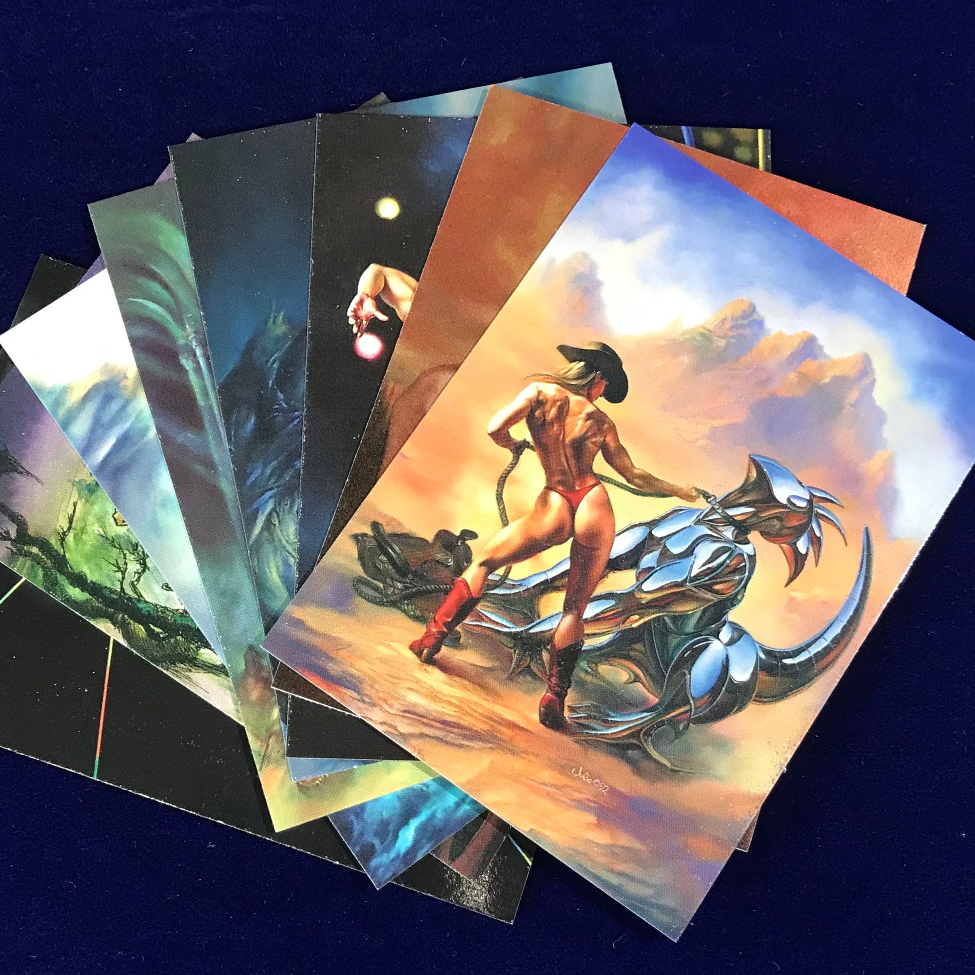 Original unopened 1994 vintage new stock trading card packs! Each pack contains 7 regular cards & 1 tekchrome card featuring the illustrations of fantasy art master Julie Bell. Card dimensions are 2.5"x3.5". Contains mature subject matter.