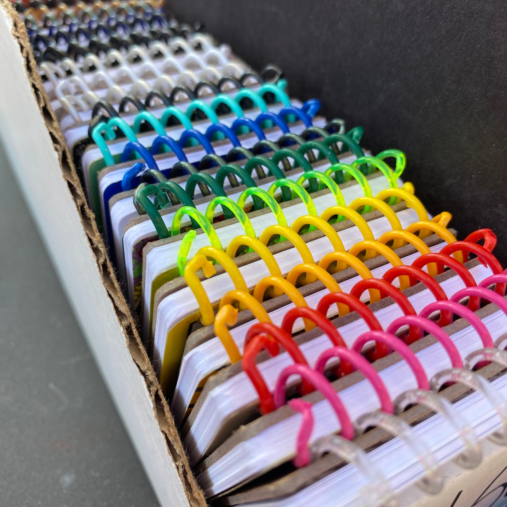 All notebooks are handmade with a recycled vintage playing card cover and bound with plastic spirals in assorted colors. They contain heavy white cardstock with rounded corners and an acid-free recycled chipboard backing. Vortex branded.