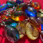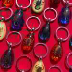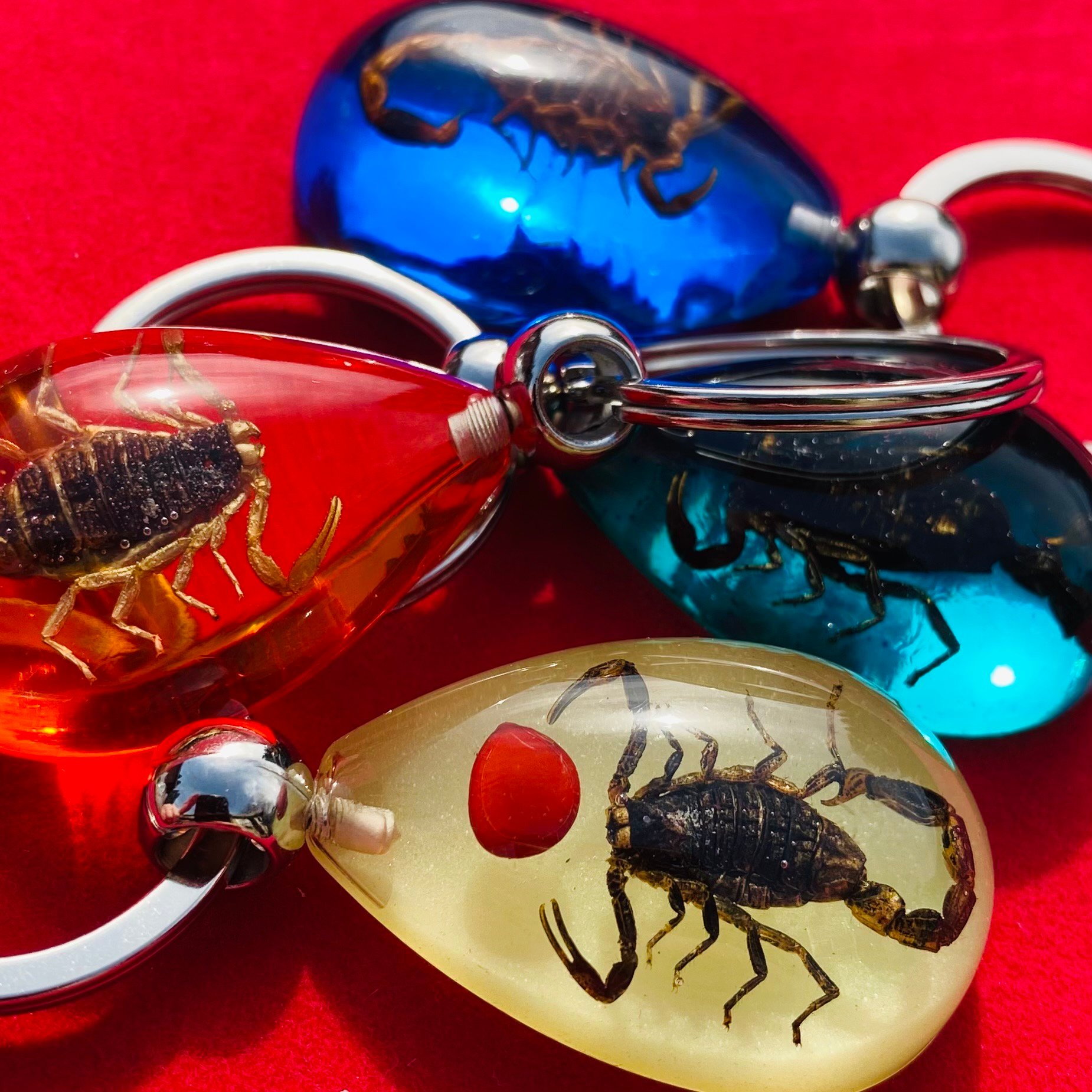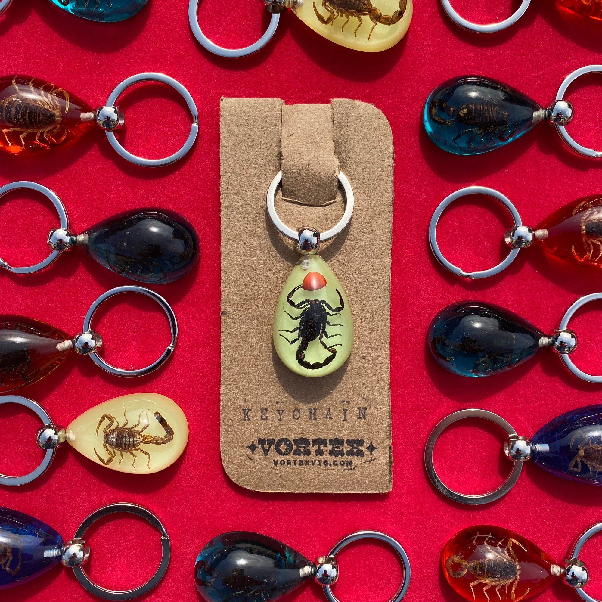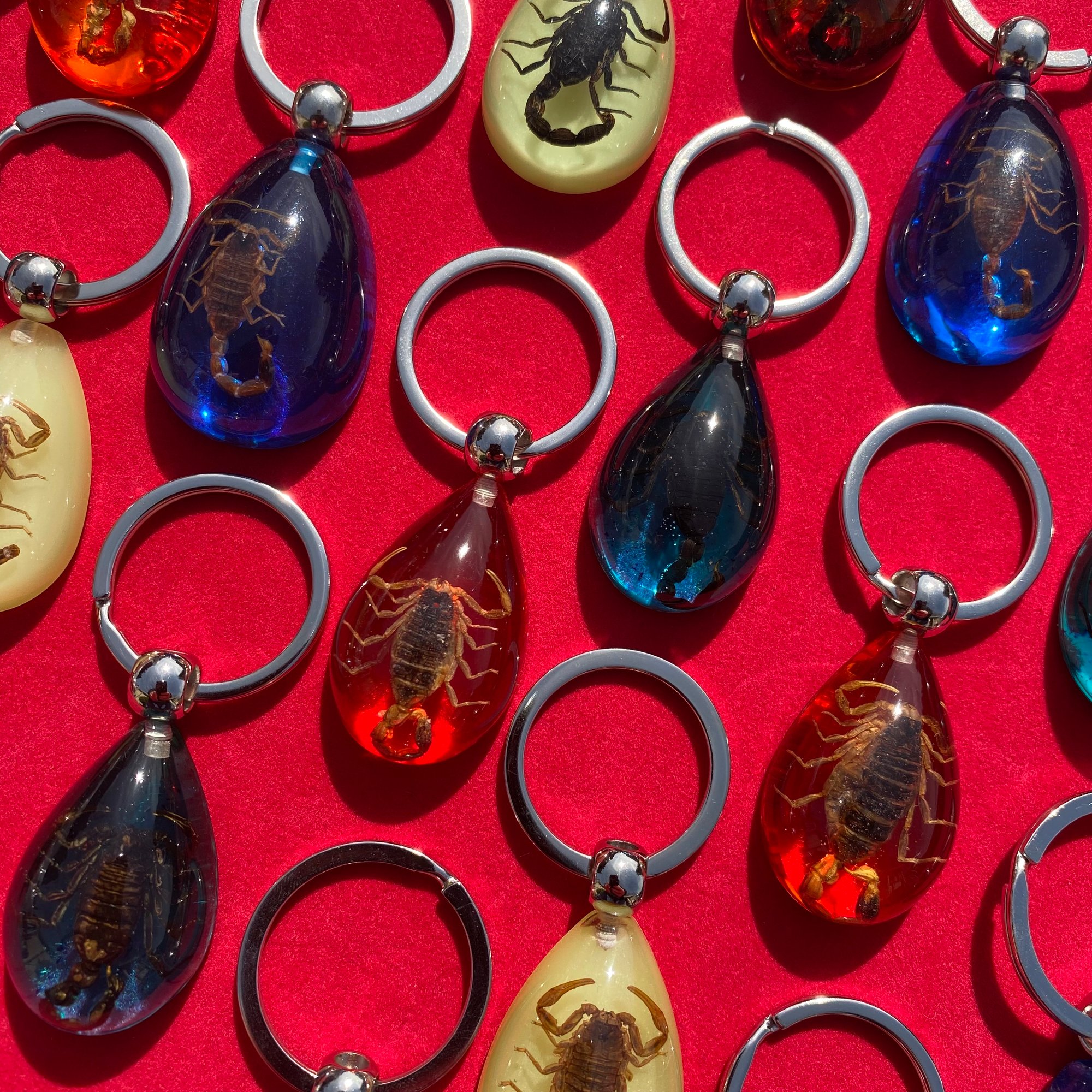 Real scorpion preserved in a translucent resin teardrop attached to a convenient metal key ring. These stinging tears come in assorted colors, all orders are selected at random— or you can shoot us an email or drop requests for specifics in your order comments.