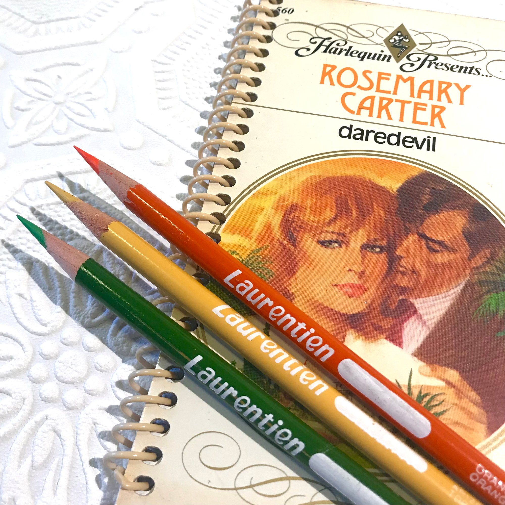 Journal set includes one blank spiral bound notebook made from a recycled vintage paperback and three freshly sharpened vintage colored pencils. The notebook covers are reinforced with acid-free recycled chipboard and interior pages are smooth white cardstock perfect for pen & pencil. The included pencil assortments are artist quality vintage Prismacolors or Laurentien brand, all color-matched to the novel's theme. Orders chosen at random or feel free to leave specific requests in the order comments.